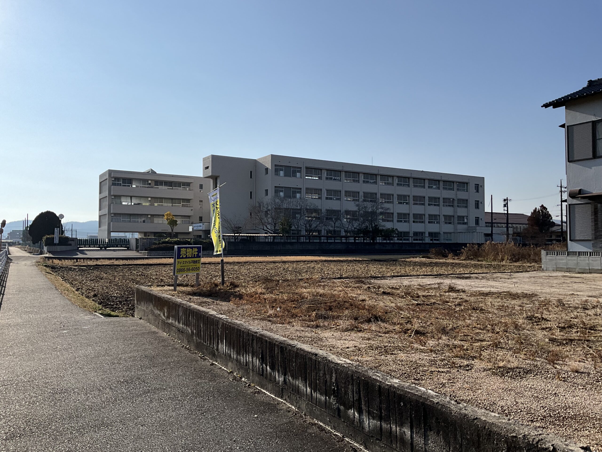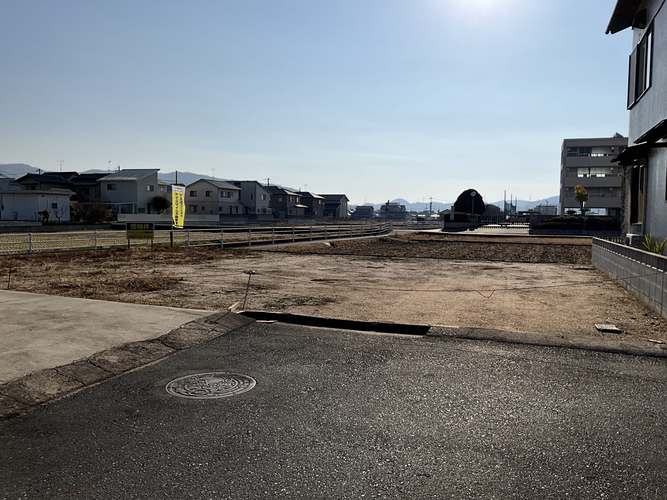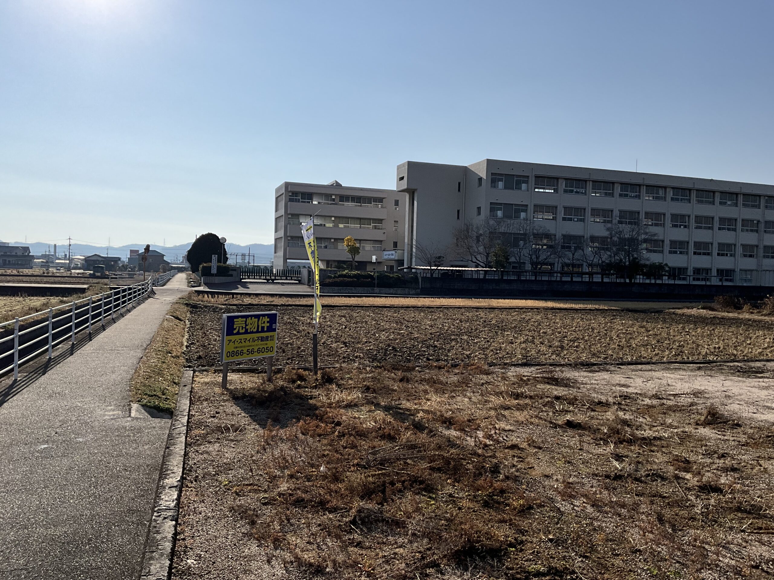 ・北道路で角地、西側に道路があり、南側に田と真備東中学校が見える物件です。