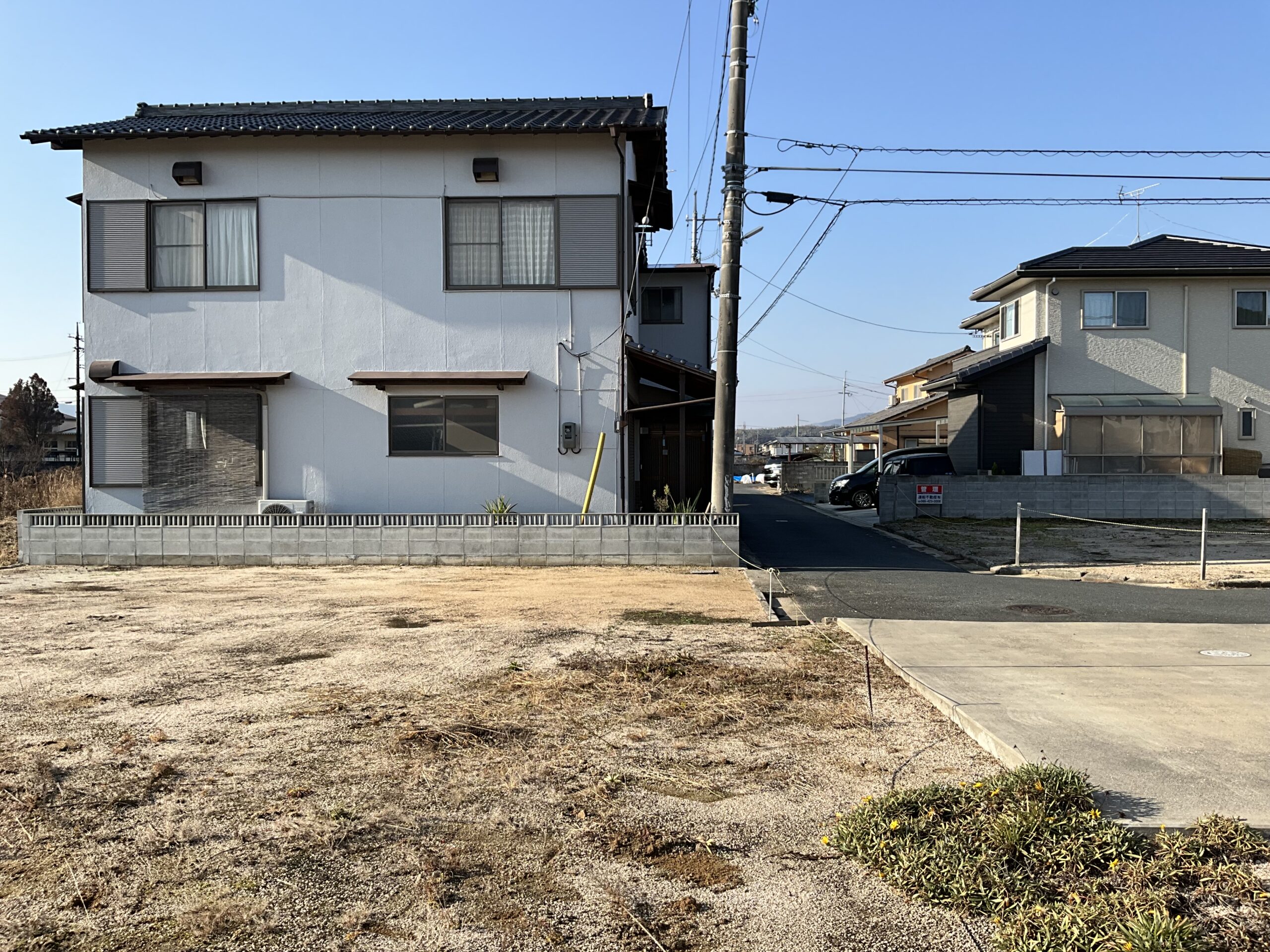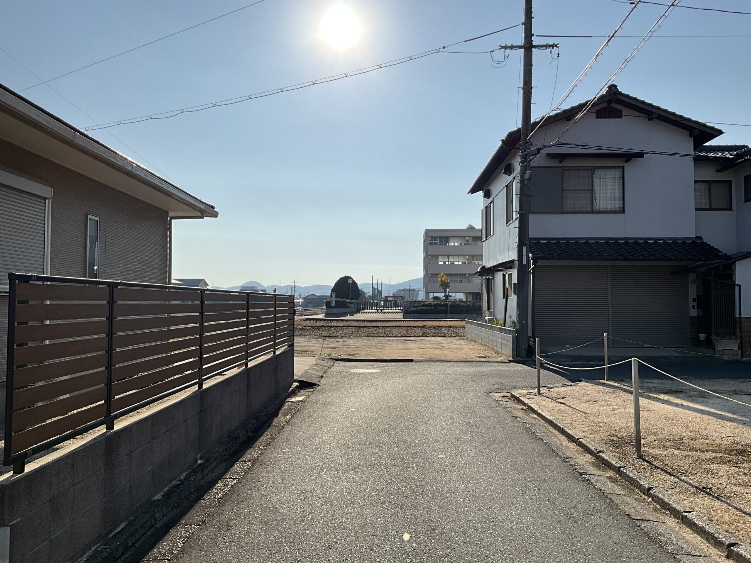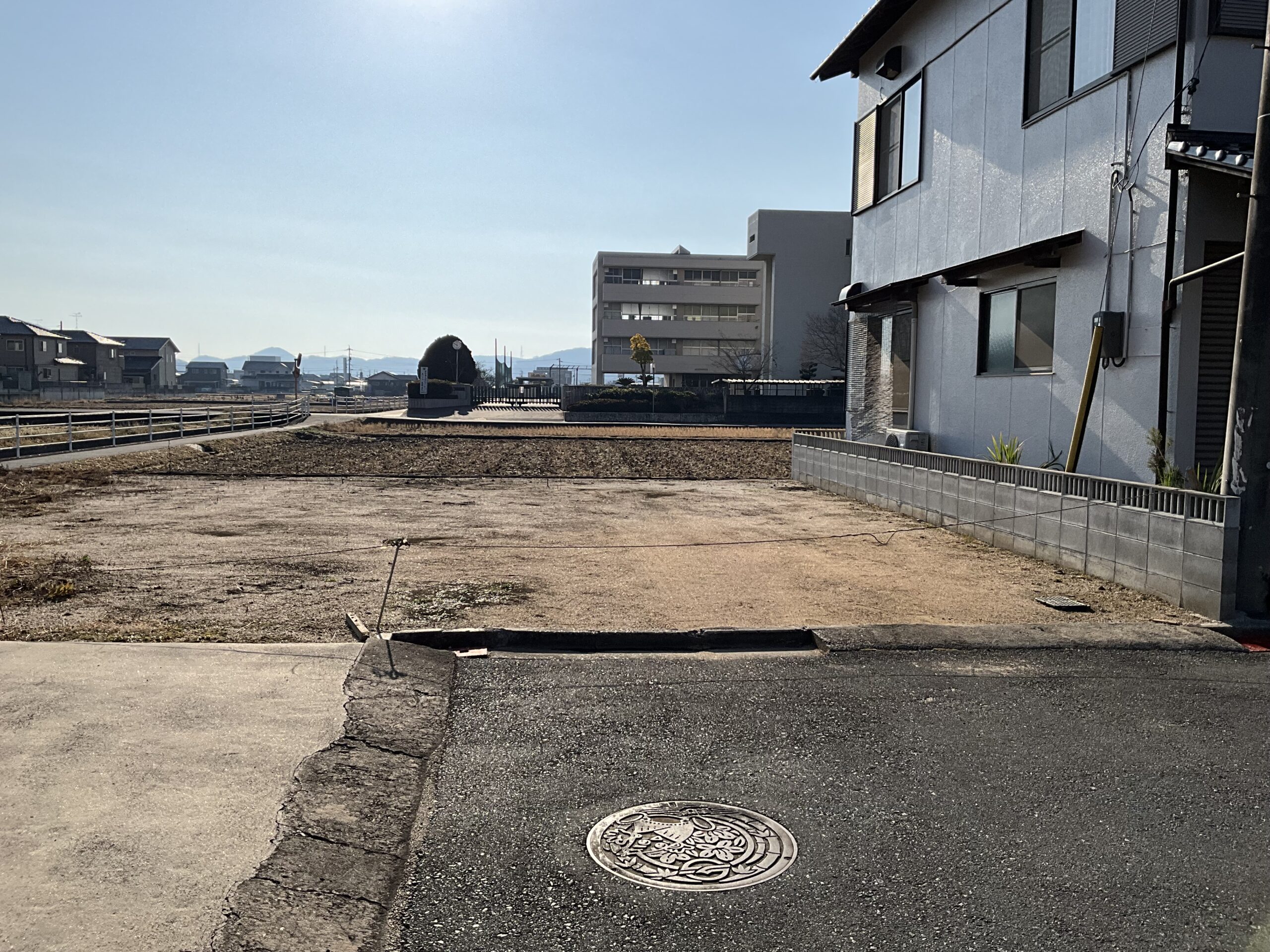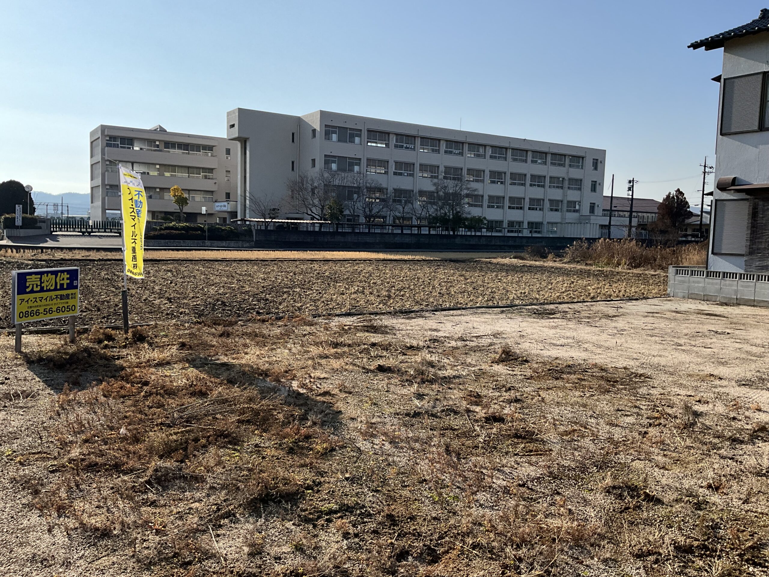 ・北道路で角地、西側に道路があり、南側に田と真備東中学校が見える物件です。
